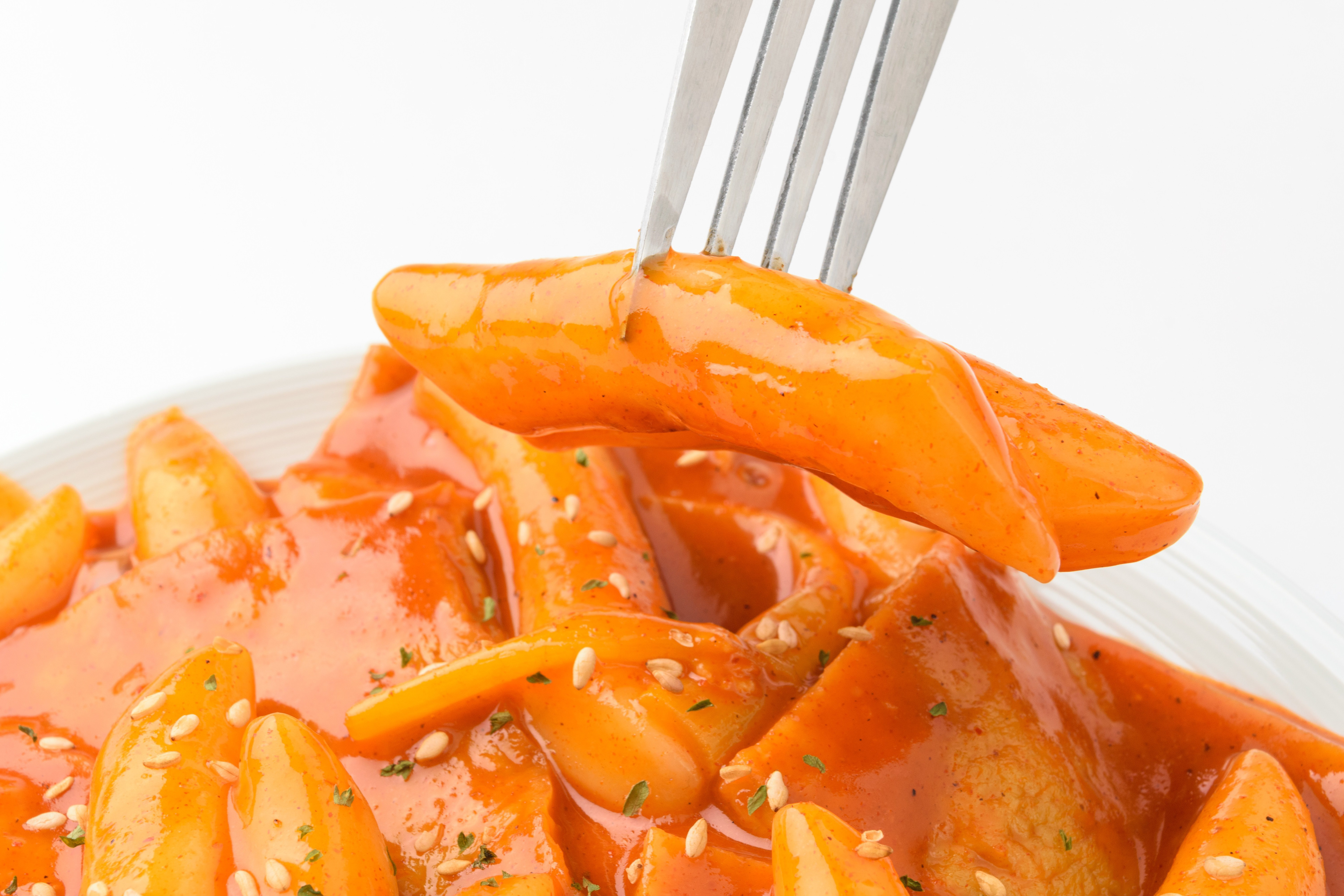 Tteok bedeutet auf Koreanisch "Reisröllchen" und Tteokbokki wird aus Reisröllchen und der pikant-scharfen Gochujang Sauce zubereitet und ist ein beliebtes Street Food in Korea.